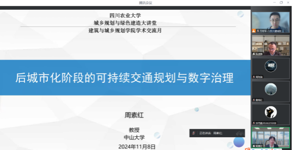 2024年11月8日,新葡的京集团350vip8888成功举办了“城乡规划与绿色建造大讲堂”线上学术活动。本次活动特别邀请了中山大学周素红教授作题为“后城市化阶段的可持续交通规划与数字治理”的专题报告,讲座由学院副经理张凌青主持,学院全体研究生参加。